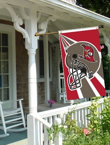 Large Tampa Bay Buccaneers football helmet flag. Tampa Bay Buccaneers 3ft x5ft NFL premium tailgate banner has a wide, reinforced headband with two grommets for flying. Looks great indoors or flying outside when you are tailgating/cooking out on game day. Thick flag is made of heavy 150 denier polyester. Reverse image on back side.